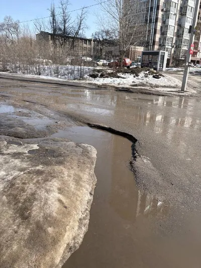 Въезд в Лазурный со стороны Одинцова. Глубину многих ям по фото трудно определить, так как они в воде, но ямы очень глубокие. Участок дороги ближе к нашим домам вообще делали всего два года назад �
