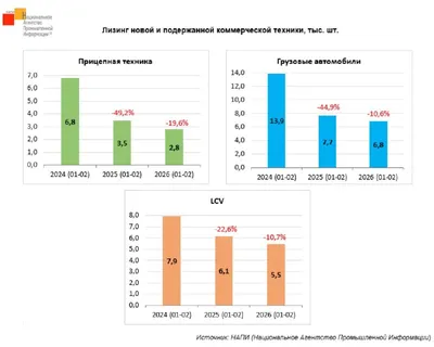 ⚡️Рынок лизинга коммерческого транспорта продолжает сокращаться Маркетинговое агентство НАПИ проанализировало динамику выдачи в лизинг грузовых автомобилей, прицепов и LCV в январе-феврале 2024-2026