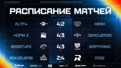 💃Итоги игрового дня третьего дивизиона BetBoom Битва Чемпионов 2026! 🕯Результаты матчей: ⏫HEAX 2:4 ⏹️ALTF4 ⏮️KOPM2 4:3 ⏩DEACUERDO ⏪BOGATYRI 4:3 🥫SAPPIAMO ⏏️ACHIEVERS 2:4 🔢Rise ⏮️Поднять щиты за