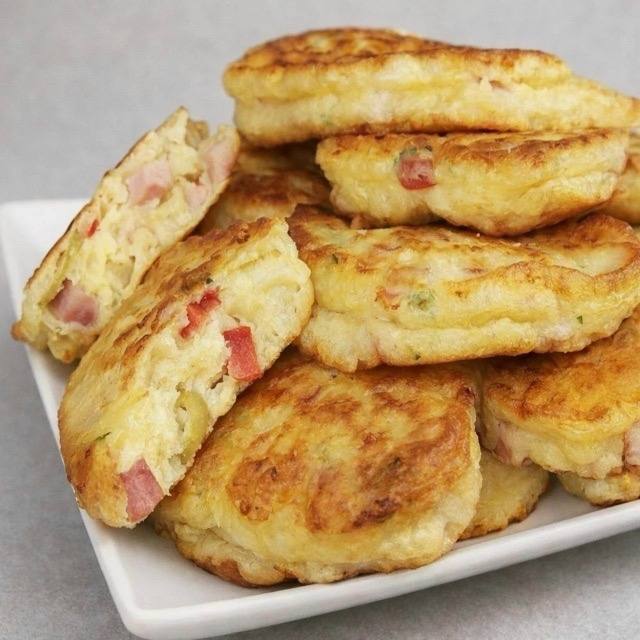 Простой завтрак за 15 минут Ингредиенты: Кефир — 1 стакан (250 мл) Яйца — 2 шт. Мука пшеничная — 1 стакан (250 мл) Сыр твёрдый (моцарелла или любой) — 70 г Ветчина (или колбаса) — 100 г Болгарс
