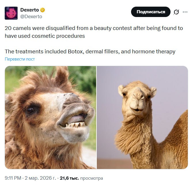 20 верблюдиц дисквалифицировали с конкурса красоты после того, как выяснилось, что им делали ботокс, филлеры и другие косметические процедуры. Инцидент произошёл в Омане: на фестивале верблюжьей красо