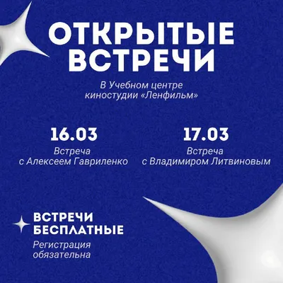 Ближайшие открытые мероприятия в учебном центре киностудии «Ленфильм» ☺️ 16 марта – открытая встреча со сценаристом Алексеем Гавриленко. На мероприятии мастер поделится опытом работы на проектах, от