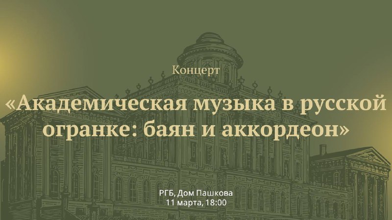 🔔 Приглашаем на музыкальную встречу. 📍 РГБ, Дом Пашкова 📆 11 марта, 18:00-19:30 ➡️ Вход по предварительной регистрации 🪗 Первый концерт из цикла «Академическая музыка в русской огранке» посвящен