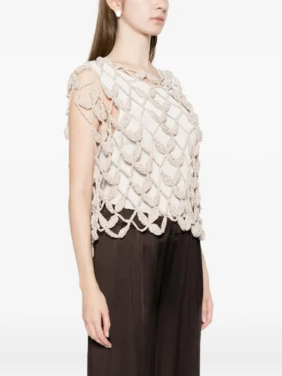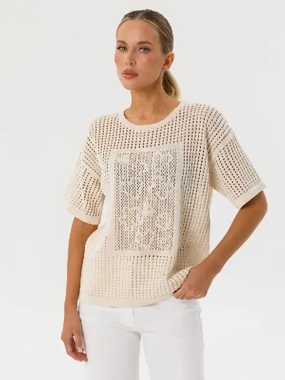 Еще один вариант с прямоугольной вставкой в центре: джемпер от Stilla. Внутри прямоугольной рамки - цветы и сердечки на фоне сетки