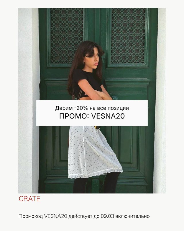 последний день скидок по промокодам к 8 марта: 🟢 crate -см. юбки 🟢 All we need - см. пальто и рубашки 🟢 Daisyknit - см. пальто и юбки 🟢 Sanchy - см. юбки и верхнюю одежду 🟢 Lusavou - лоферы и б
