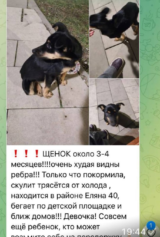 ❗️❗️❗️ЩЕНОК около 3-4 месяцев!!!!очень худая видны ребра!!! Только что покормила, скулит трясётся от холода , находится в районе Еляна 40, бегает по детской площадке и ближ домов!!! Девочка! Совсем ещ