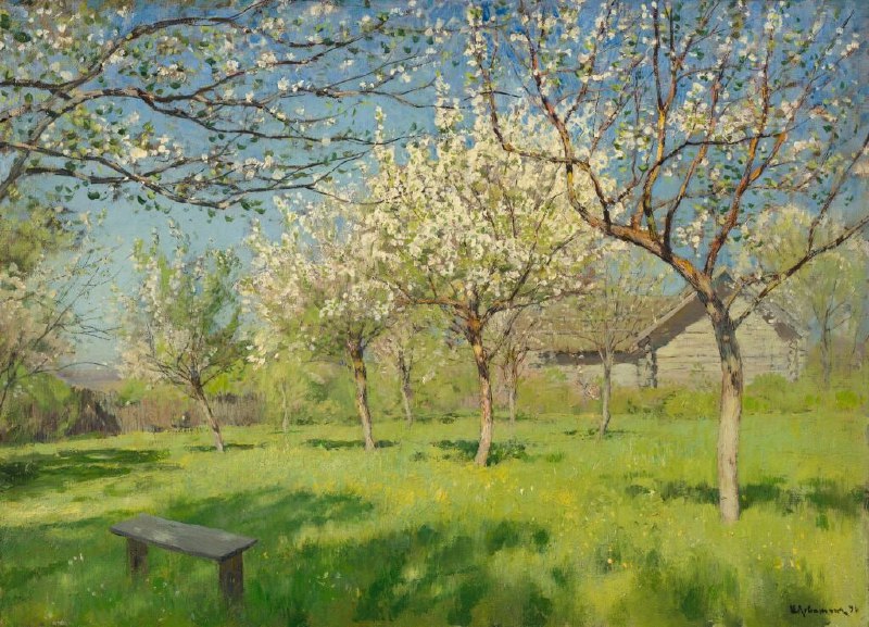 "Цветущие яблони", 1896 Холст, масло, перо, тушь. 37 х 50 см «Цветущие яблони» созданы художником с особой живописной деликатностью. Тени ветвей на весенней траве подвижны и трепетны. Красочный слой
