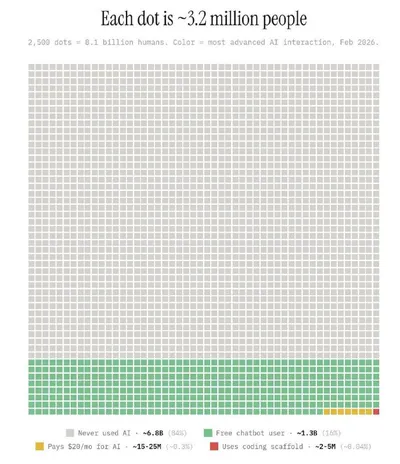 🟠Сейчас в сети все активно делятся вот этим графиком, глядя на который, казалось бы, можно выдохнуть и ничего ни с каким ИИ не делать. На картинке видно примерно следующее: ⚪️84% людей в мире никогда