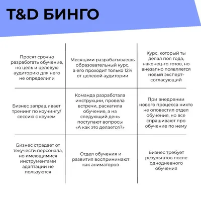 💥T&D бинго пятничный #юмор Аня Галкина, амбассадор LifeLongLearning, собрала с авторов HRPROSVET вот такое T&D бинго - самые узнаваемые боли обучаторов. Я решила его немного дополнить особенностями