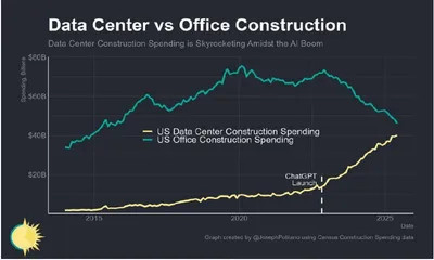 📍Люблю интересные графики) На этом графике видно, как после запуска ChatGPT резко выросли инвестиции в строительство дата-центров в США. До 2022 года рост был умеренным, но затем начался настоящий с