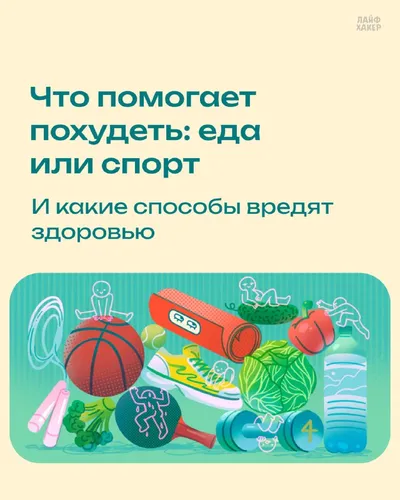 Что помогает похудеть: еда или спорт В карточках разбираемся, стоит ли отказываться от любимой еды или устраивать себе трёхчасовую пробежку. И чего точно не стоит делать — вред для здоровья будет бол