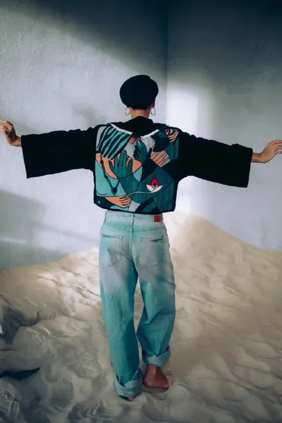 Наш гобелен "Цветок" иногда используют в качестве декоративного элемента одежды.