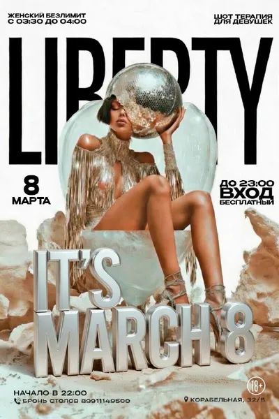 ГОТОВЫ ВСТРЕТИТЬ 8 МАРТА В LIBERTY? 🌹 Позавчера мы громко открыли серию вечеринок IT’S MARCH 8, а сегодня продолжим ещё ярче ✨ ✨ Что вас ждёт этой ночью: 💓 ЖЕНСКИЙ БЕЗЛИМИТ с 03:30 до 04:00 Всем