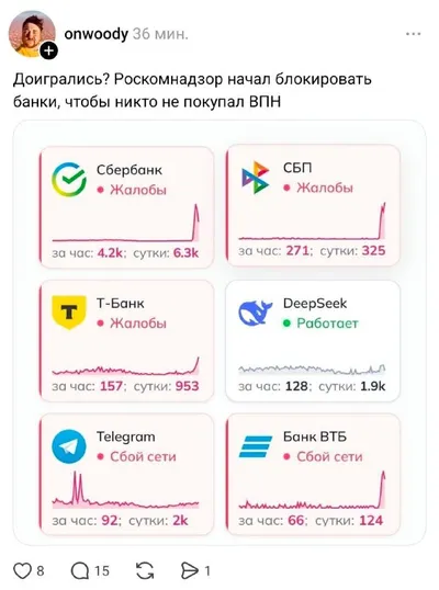 «РКН начал блокировать банки, чтобы люди не платили за ВПН». Россияне начали день без работающих банков. По всей стране начали отваливаться все, от Сбера до Озона. Местами не работали даже банкоматы.