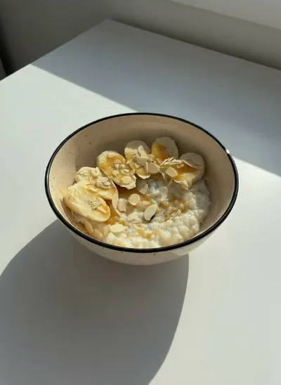 ☀️☀️☀️☀️ Как разнообразить завтрак: готовим рисовую кашу, добавляем любые сухофрукты (у меня изюм). Нарезаем банан, сверху поливаем кокосовой сгущенкой и посыпаем миндальными лепестками. Приятного