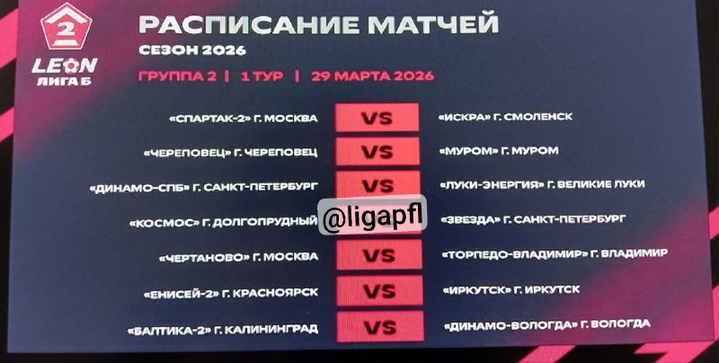 Игры 1-го тура, 29 марта (воскресенье), группа 2 По нашей информации, первый тур будет таким: «Спартак-2» (Москва) – «Искра» (Смоленск) «Череповец» – «Муром» «Динамо-СПБ» – «Луки-Энергия» «Космос