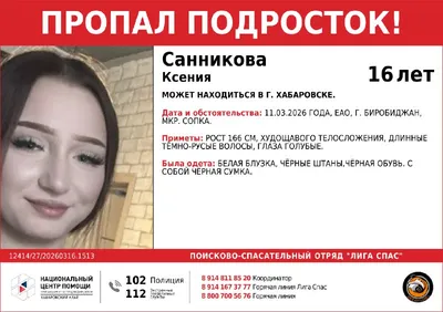 @ligaspas информация от ДПСО Лига Спас: ПРОПАЛ ПОДРОСТОК! Санникова Ксения, 16 лет. МОЖЕТ НАХОДИТЬСЯ В Г. ХАБАРОВСКЕ. 🦊 Дата и обстоятельства: 11.03.2026 года, ЕАО, г. Биробиджан, мкр. Сопка. 🦊 Прим