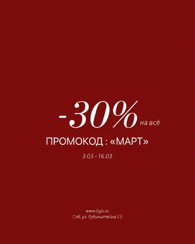 Последний день действует промокод «МАРТ» на скидку -30% на всё Усейте воспользоваться предложением до 16.03 до 21:00 На сайте www.ligio.ru В магазине по адресу : спб, ул. Рубинштейна 23
