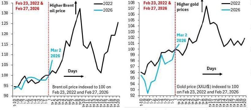 Нефть и золото как индикаторы кризиса Графики показывают реакцию двух ключевых сырьевых индикаторов — нефти Brent и золота — на крупные геополитические события. В обоих случаях точкой отсчёта служат