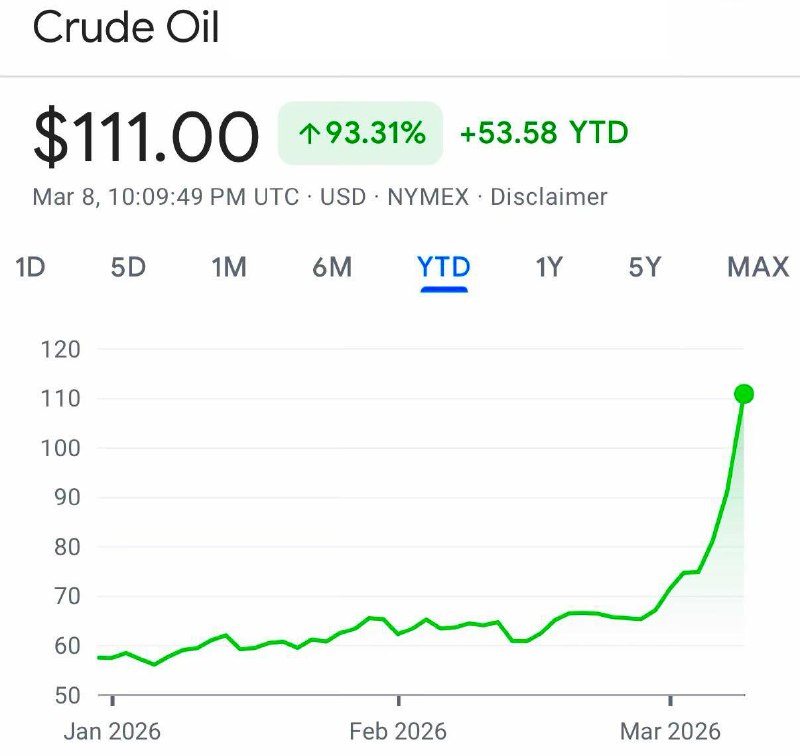 Нефть снова выше 110 долларов Цена нефти на мировом рынке резко ускорила рост. К началу марта котировки сырой нефти достигли около 111 долларов за баррель. С начала года рост составил более 93%, что