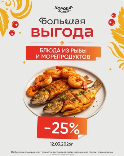 Новая порция скидок! ❤️ В ЛИНИИ вас ждут слишком вкусные предложения от бренда ХОРОША ЛОЖКА, которые вы точно не захотите пропустить! В наших гипермаркетах: 🔹12.03 - скидка 25% на блюда из рыбы и м