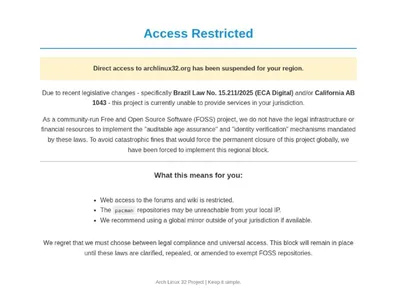 🖥 Проект ArchLinux 32 ограничил доступ для пользователей из Бразилии. Причина - недавно принятый в стране закон, который требует проверку возраста на уровне операционной системы. Но это скорее обхо