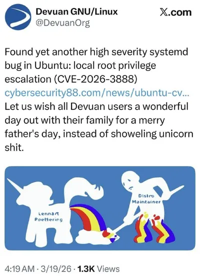 Дыра в systemd Найдена критическая уязвимость в Ubuntu, которая позволяет локальным злоумышленникам получать root-доступ к системе из-за systemd. Дистрибутив Devuan, который не использует systemd от