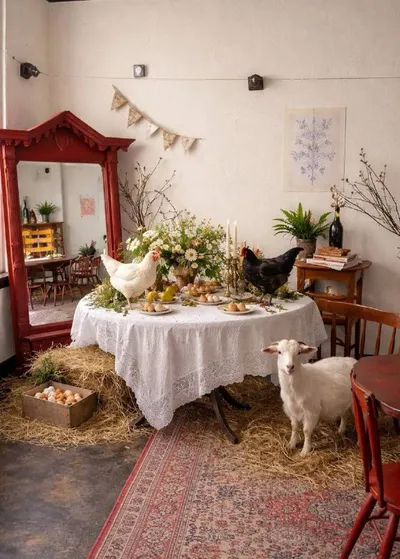 В этом году мы решили соединить любимый дачный стиль, уютную сельскую эстетику и пасхальное настроение 🐥 Так родилась идея новой фотолокации — с цветами, сеном, козочками и курочками. Немного наивно