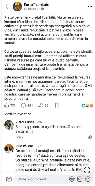 Олеся Стамате обнаружила в социальных сетях неизвестную страницу, спонсирующую пост, что высокие цены на бензин в Молдове — это «цена свободы». Где-то мы уже это слышали, от кого-то из пасдюков🤔 И е