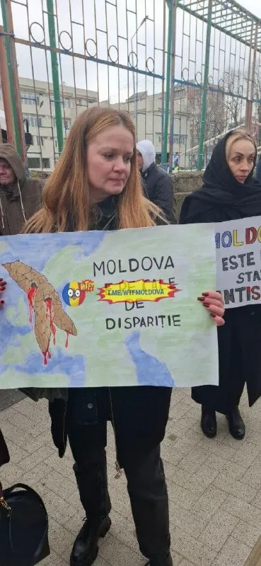 ‼️ Люди держат в руках плакаты на молдавском и английском языках: Молдова – это антисоциальное государство! Молдова находится на грани исчезновения! До чего режим довёл народ __ ‼️ Oameni țin în mâi