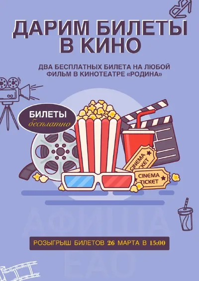 🍿Дарим два билета в кинотеатр «Родина» Внимание всем любителям кино! Мы решили разыграть среди своих подписчиков два билета на сеанс в кинотеатр. Дату, время и фильм выбираете сами! Условия участия