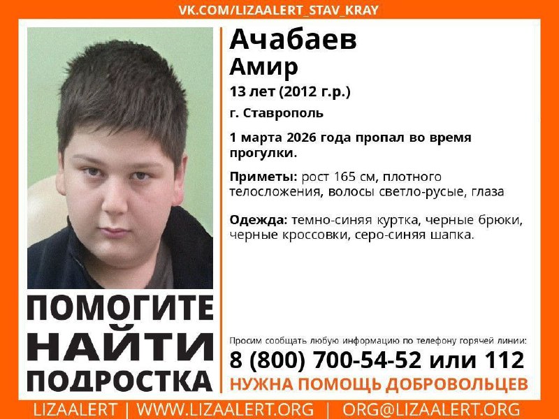 Внимание! Помогите найти подростка! Ачабаев Амир, 13 лет. г. Ставрополь 1 марта 2026 года пропал во время прогулки. ⚡️Ставрополь Live