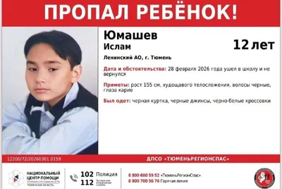 Внимание пропал ребенок! Юмашев Ислам 2013 г.р. (12 лет) Ленинский АО, г. Тюмень. 28 февраля 2026 года ушел в школу и не вернулся. Приметы: рост 155 см, худощавого телосложения, волосы черные, глаз