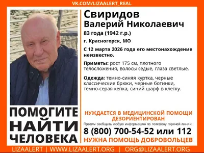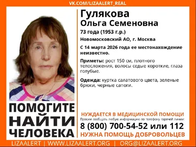 Внимание! Пропала Семенова (Спорова) Марина Анатольевна, 85 лет, ЮЗАО, г. Москва, 10 марта 2026 года вышла из дома и не вернулась. Приметы: рост 154 см, нормального телосложения, волосы седые, глаза