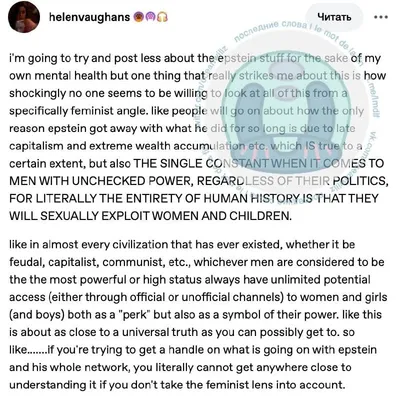 Я постараюсь поменьше постить обо всём, что связано с эпштейном, ради своего же душевного спокойствия, но меня до сих пор поражает, что никто, кажется, не хочет взглянуть на ситуацию с феминистской то