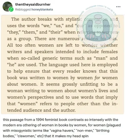 «Авторка нарушает стилистические порядки и использует слова “мы”, “нас”, “наше” вместо “они” и “их”, говоря о женщинах как о группе. Для этого есть множество причин. Слишком часто женщинам остается ли