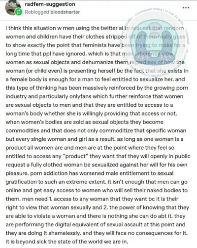 По-моему, ситуация с тем, что мужчины используют твиттеровский ИИ, чтобы генерировать фото случайных женщин и детинь без одежды, реально подчёркивает именно то, что феминистки пытались донести годами,