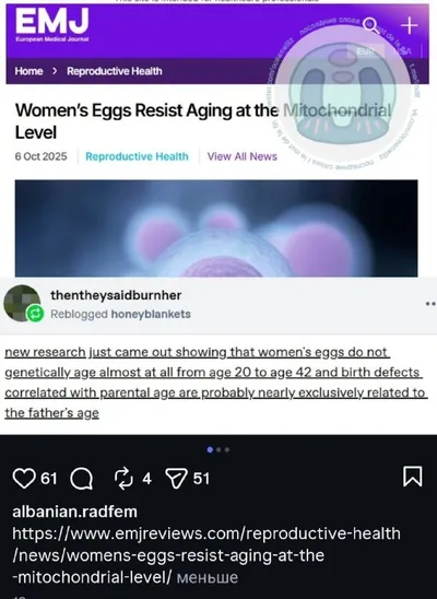 Исследование: «Женские яйцеклетки сопротивляются старению на уровне митохондрий» Только что вышло новое исследование, которое доказывает, что у женщин в возрасте от 20 до 42 лет яйцеклетки генетическ