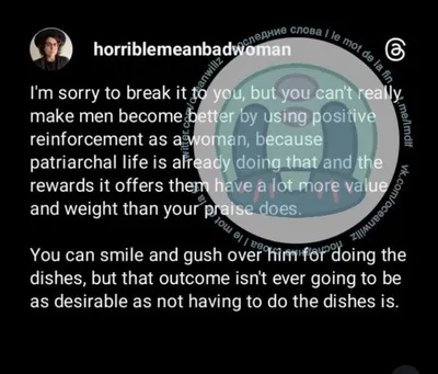 Извините, что говорю это, но вы не сможете сделать мужчин лучше, используя позитивное подкрепление и будучи женщиной, потому что жизнь в патриархате уже даёт им позитивное подкрепление и награда, кото