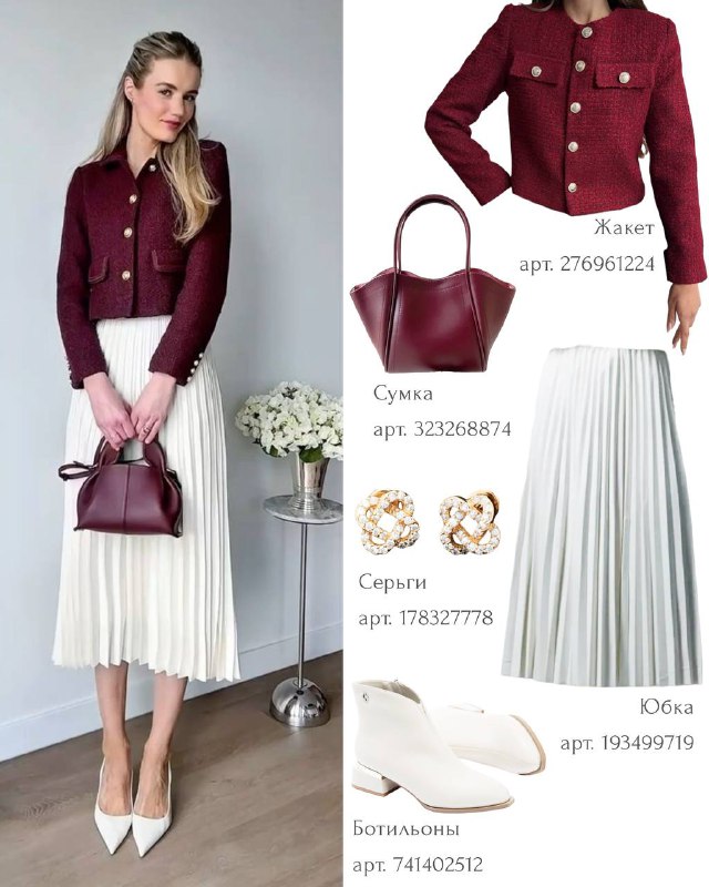 Контраст фактур делает образ интересным: твидовый жакет уравновешивает лёгкую плиссированную юбку. Укороченная длина жакета открывает линию талии и сохраняет пропорции с объёмной юбкой, благодаря чему