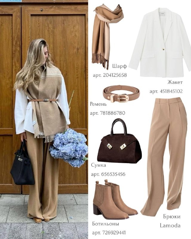 Брюки Жакет белый Палантин кашемир Ремень тонкий Ботильоны демисезонные Сумка замшевая