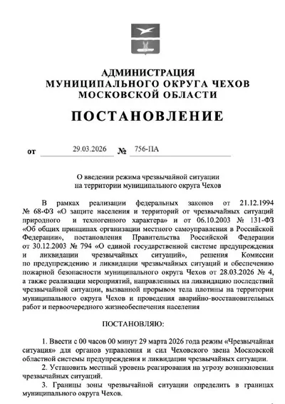 В Чехове ввели режим чрезвычайной ситуации Он начал действовать 29 марта и затрагивает всю территорию округа. Соответствующее постановление выпустила администрация муниципалитета. Отмечается, что док