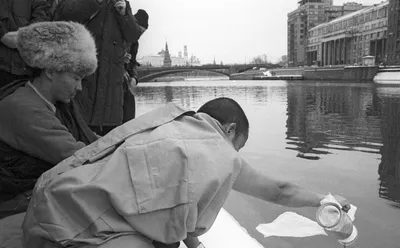 Тибетский монах высыпает священный песок в Москва-реку в рамках ритуала, 1994 год Эпоха 90-х