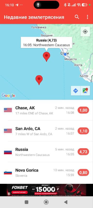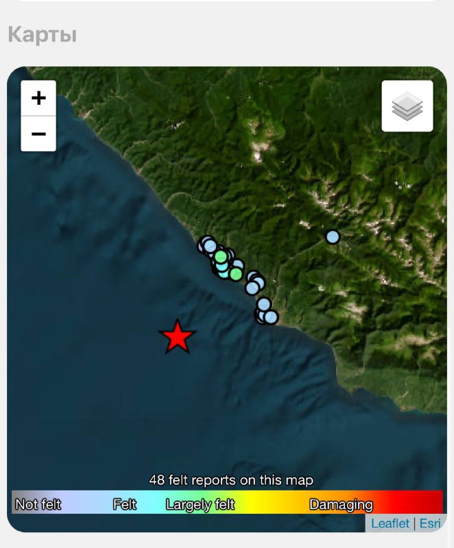 ⚡️ В районе Сочи зафиксировано ещё одно сейсмособытие По данным мониторинговых сервисов, в акватории Чёрного моря у побережья Сочи произошло землетрясение магнитудой 4,4–4,7. Эпицентр находился к за