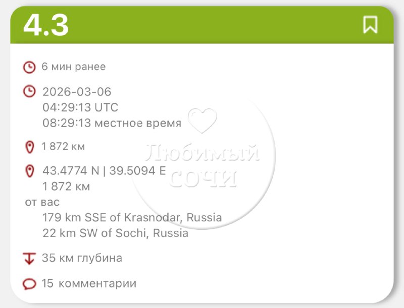 ⚡️ Сводка о землетрясении в Сочи Днём 3 марта жители Центрального района почувствовали подземные толчки. В квартирах дребезжали стёкла, слегка раскачивались люстры и деревья за окнами, люди массово н