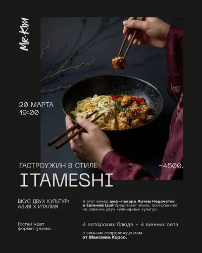 О событиях, на которые я не попадаю😢 В Mr.Kim 20 марта в 19:00 пройдет гастроужин в стиле итамеши. Кухня итамеши отличается использованием традиционных итальянских ингредиентов, таких как паста, сы