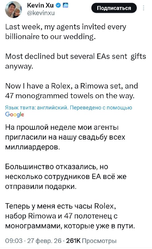 Твиттерский пригласил на свадьбу всех миллиардеров из списка Forbes — и внезапно оказался с подарками Никто из богачей, конечно, не пришел. Зато один прислал часы от Rolex, другой — чемодан от Rimowa