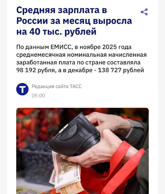Средняя зарплата россиян выросла на ₽40 тыс. за месяц и достигла ₽140 тыс. в декабре — ЕМИСС. @lutaembank