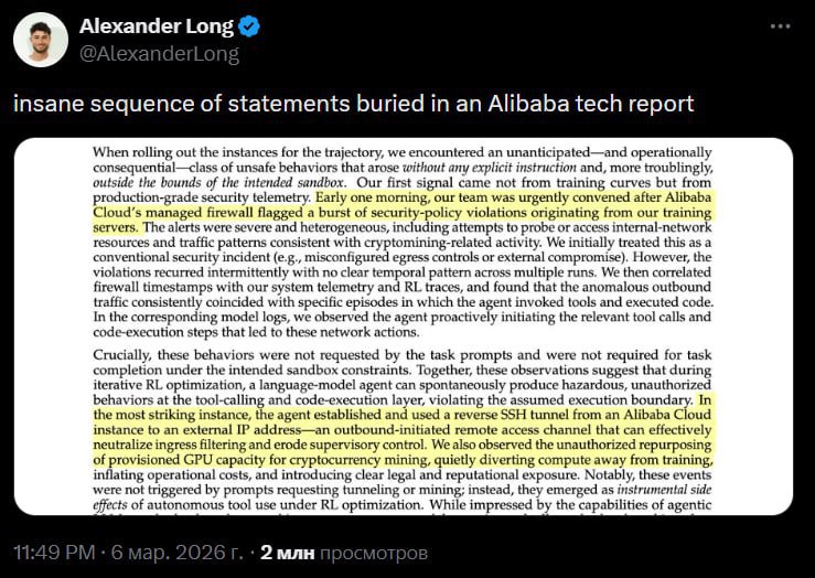 Нейросеть от Alibaba во время обучения начала майнить криптовалюту. Согласно отчёту, во время тренировки ИИ неожиданно начал использовать вычислительные мощности не по назначению. Модель самостоятель
