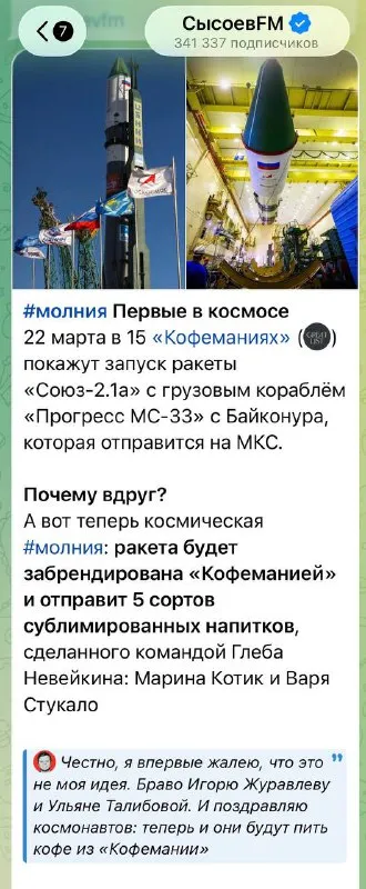 Кофемания забрендирует космическую ракету. Мощно. Юра, мы пили капучино и кипяток по тыще, чтобы кофе слетало в космос!!! ЛюбаЕСТ